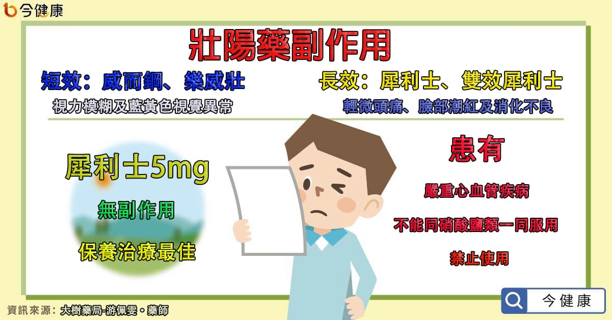 勃起功能障礙的壯陽藥物代謝主要在肝臟進行,高脂肪食物可能會延遲威而鋼與樂威壯的吸收,犀利士則不會受食物影響。PDE5抑制劑常見的副作用有頭痛、臉部潮紅及消化不良,除此之外,需提醒病人使用威而鋼與樂威壯藥物期間,注意有無出現視力模糊及藍黃色視覺異常徵兆;犀利士會影響肌肉上的第十一型磷酸二酯酶(PDE11),可能會引起背痛及肌肉疼痛的副作用。使用這類藥物有嚴重心血管疾病或病史者則不建議使用,此外若與甲型交感神經阻斷劑併用(如:Doxaben,可迅),需注意低血壓副作用;若與含有硝酸鹽類成分的血管擴張劑併用(如Isobide,易適倍、Ibimo,愛彼脈、Silvinol,喜必諾、Nitrostat,耐絞寧等),可能會造成嚴重血壓下降而危及生命,因此服用威而鋼與樂威壯與含有硝酸鹽類成分最少要間隔24小時,而犀利士由於作用時間較長,必須間隔4-5天。去年美國食品衛生管理局核准了第四種PDE5抑制劑Avanafil(Steudra),建議於性行為前30分鐘服用,但目前台灣尚未核准上市。