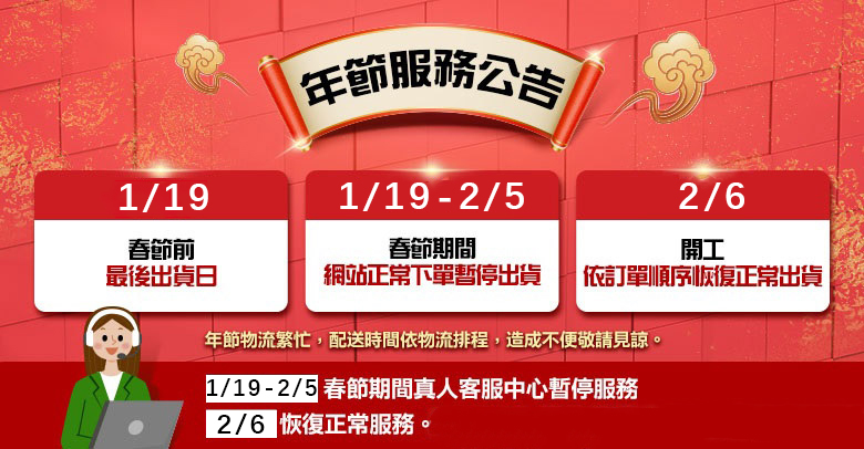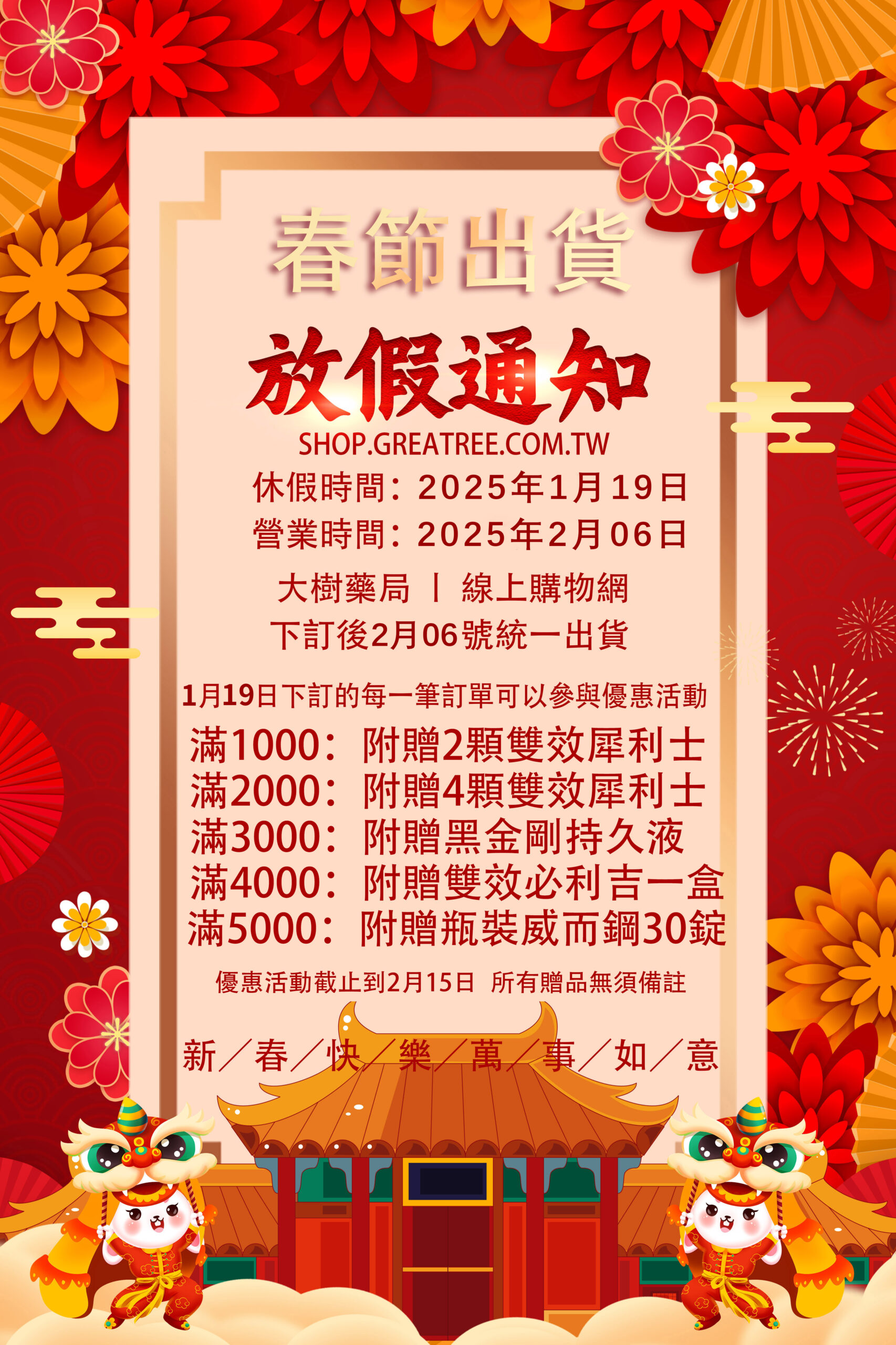 為感謝您的支持,大樹藥局在春節期間特別推出 限時優惠活動 及調整配送服務,讓您購物更安心!詳情如下: