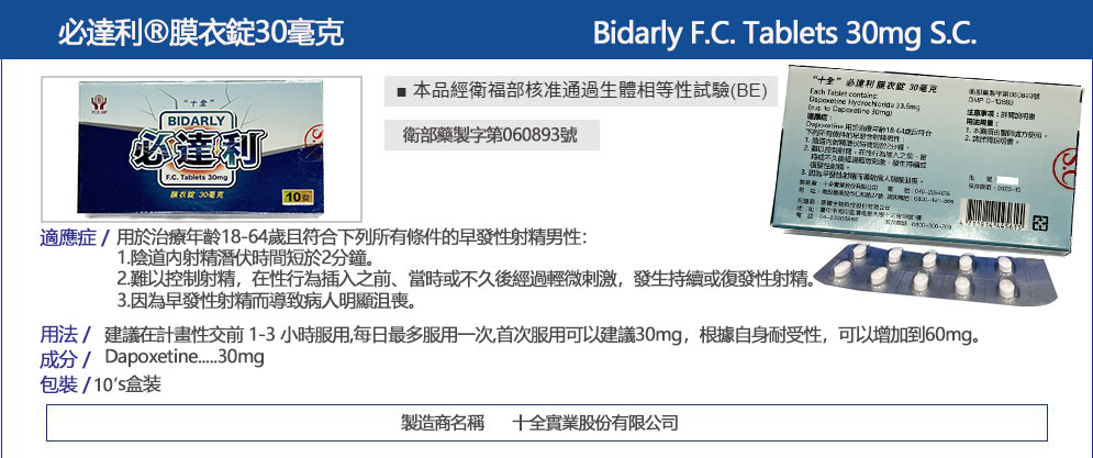 產品名稱:必達利 Bidarly 30mg 膜衣錠