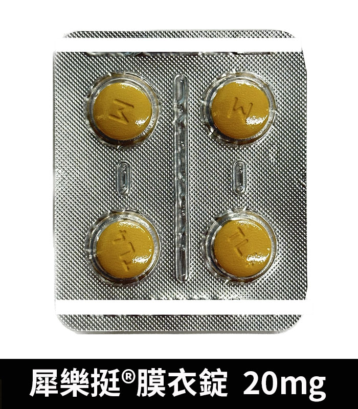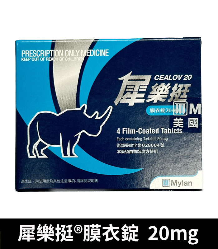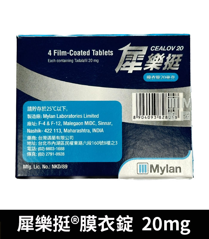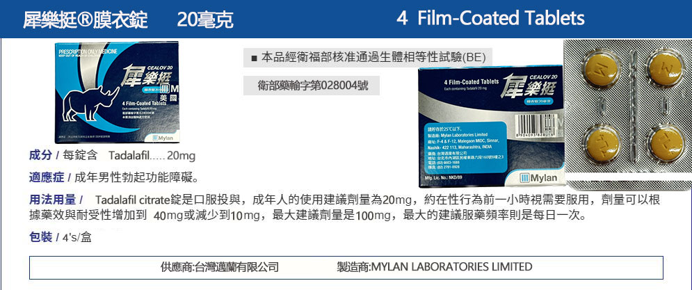 • 每盒含 4 錠 犀樂挺膜衣錠 Cealov 20mg,每錠含 20mg Tadalafil。