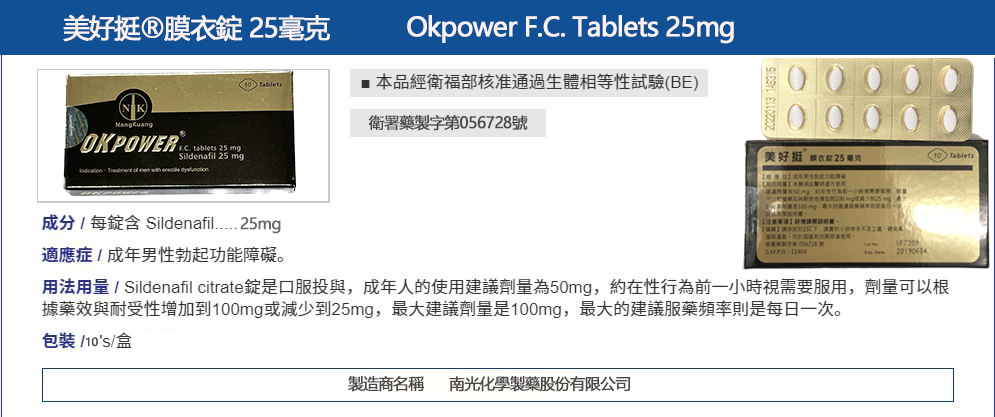 美好挺 OKPOWER 25mg 是台灣研發製造的合法壯陽藥品,主成分為西地那非(Sildenafil)25毫克,是威而鋼的學名成分。此產品特別針對初次接觸助勃藥物者、輕度勃起功能障礙(ED)患者、以及對高劑量副作用較為敏感者設計。提供溫和穩定的藥效,協助男性在性刺激下恢復自然勃起能力,提升性生活品質。