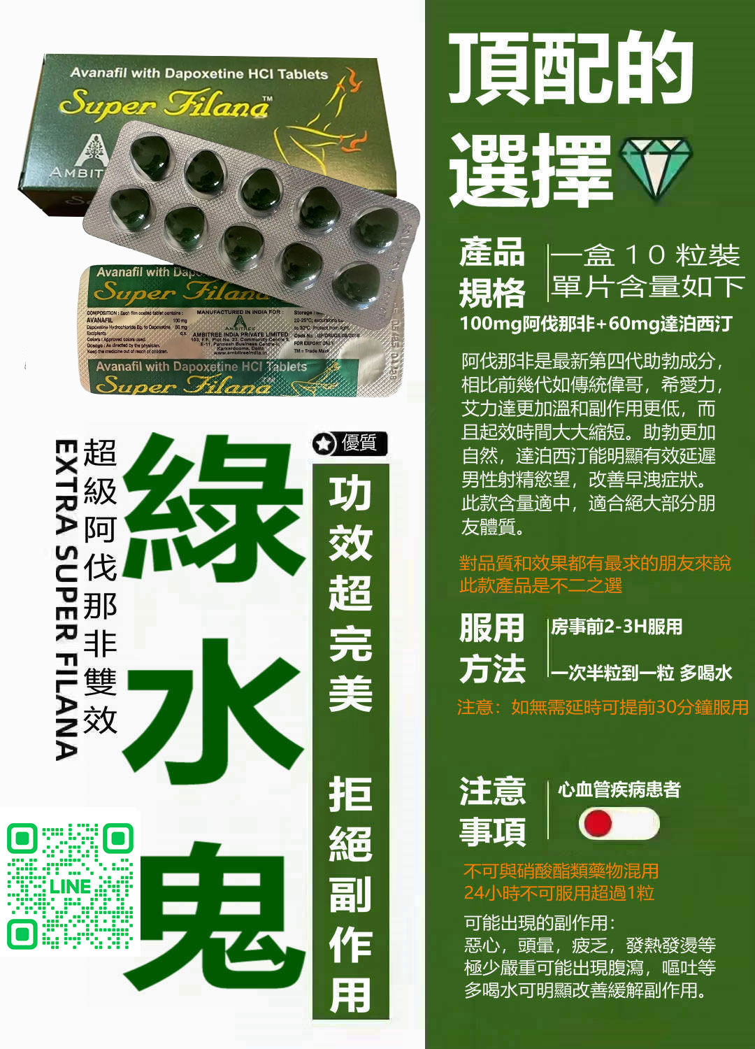 搶先評價 “印度綠水鬼 Super Filana 160mg| 阿伐那非 助勃+持久 1盒10顆” 取消回覆