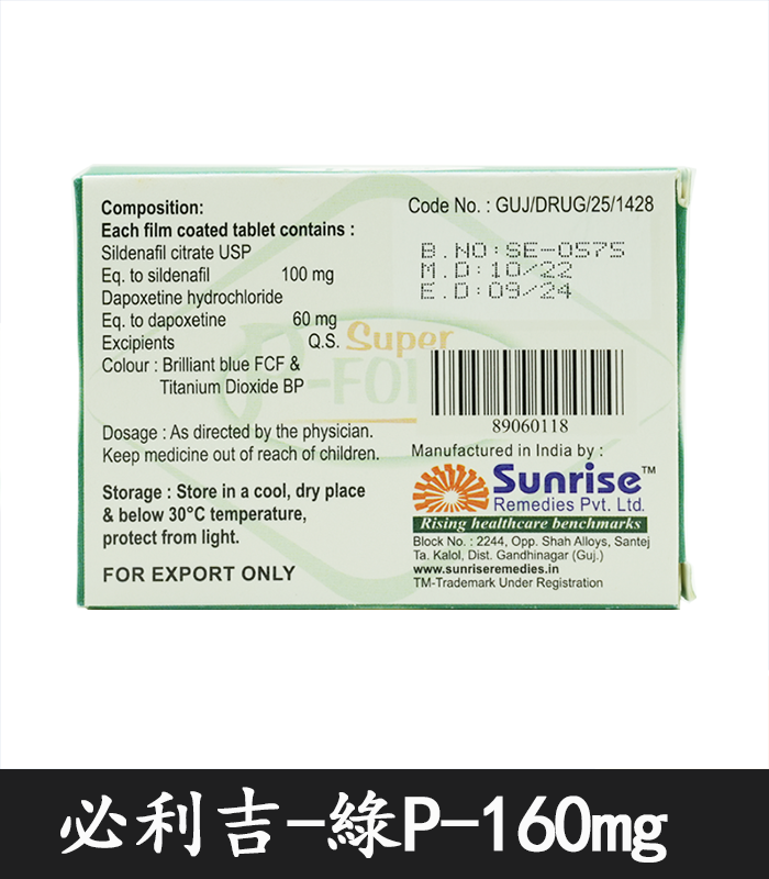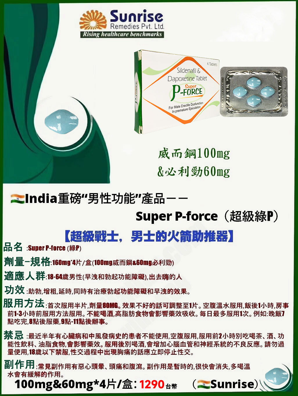 綠版必利吉 Super P-force 是一款結合助勃與延時雙重功效的壯陽藥。它含有100mg的西地那非(Sildenafil)和60mg的達泊西汀(Dapoxetine),這兩種成分能夠有效解決勃起功能障礙(ED)和早洩(PE)的問題,是一款集增硬、持久和延時於一體的雙效藥物,深受全球男性用戶的青睞。