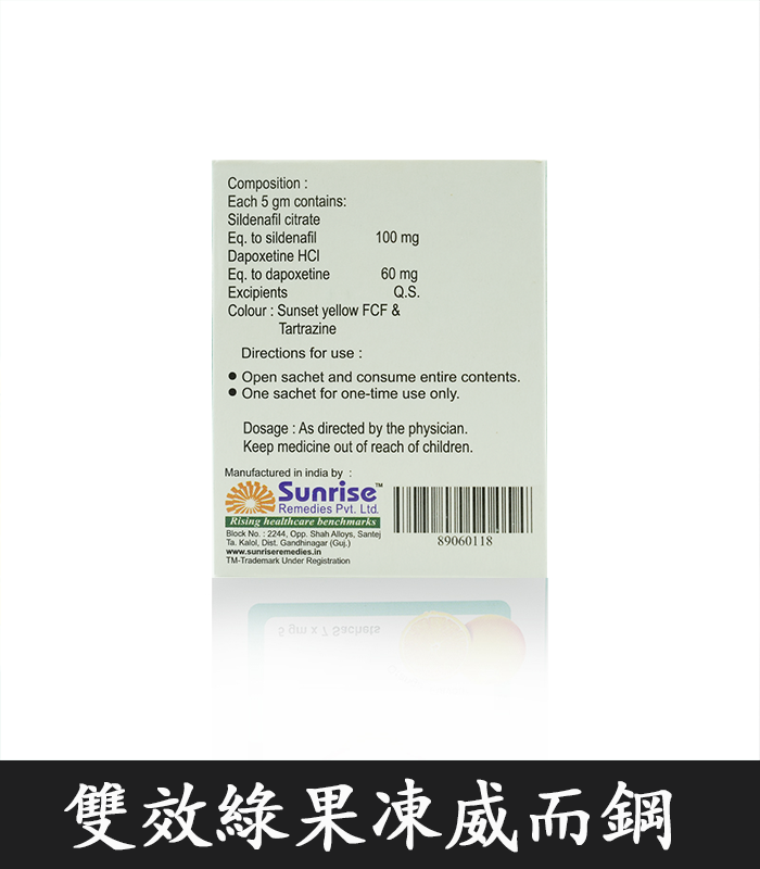 【成分】:每包含100mg西地那非(威而鋼)+60mg達泊西丁(必利勁)