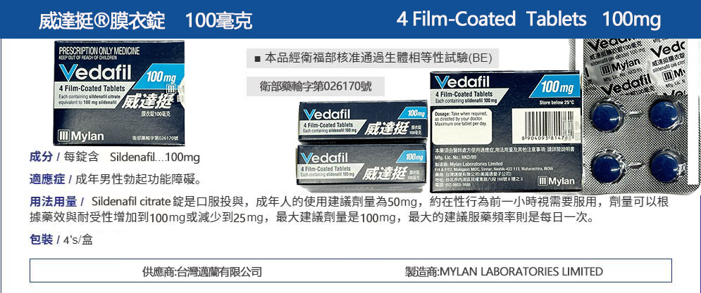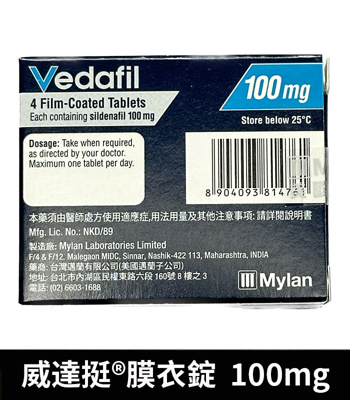 - 劑量建議:建議在性行為前約60至90分鐘服用一顆威達挺膜衣錠 Vedafil。根據個人對藥物的反應,可以調整50mg劑量,但每日最多服用一次,且不可超過建議劑量。