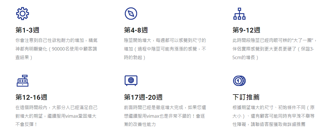 • 第12-16週 在這個時間段內,大部分人已經滿足自己對增大的期望,繼續服用vimax鞏固增大不會反彈!